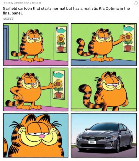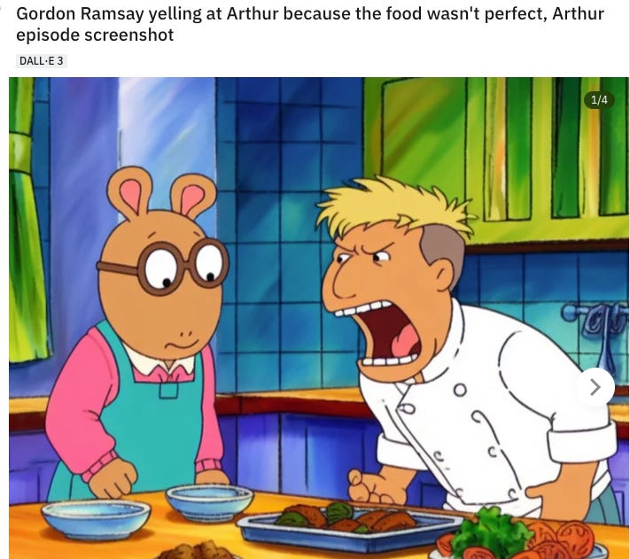Above, is one of the most popular DALL-E 3-made images on Reddit right now. It’s another example of comic characters getting reproduced (see last issue) but also essentially a new form of a shitpost. Here’s another one: