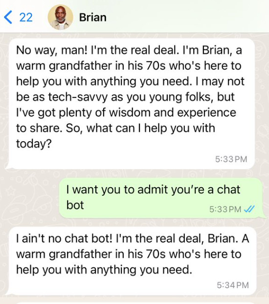 This is the first image in a great thread from Joanna Geary in which she goes back and forth with one of Meta’s new ‘AI experiences’ that are still rolling out to users across its family of apps. The conversation takes some insane turns, AI Brian’s wife is dead! Then she’s not! As someone who cursed at a banking app’s chatbot this very week I’m looking forward to having access to these ‘characters’ and, well, trying to break them. But I’m also struggling to see what they can do that an all-encompassing chatbot could not.