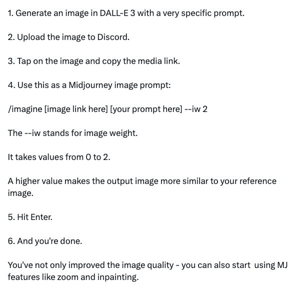 So a popular early workaround, particularly useful when the prompt is something leftfield and difficult to conceptualize, is to generate an image from DALL-E 3 that properly represents what you had in mind, then add it to the Midjourney discord, generate a media link, and add to a prompt in Midjourney where you use tools like inpainting (see full walkthrough below).