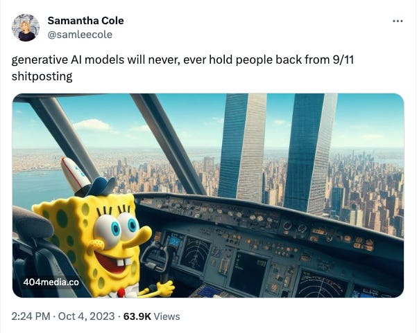 Sometimes as part of this job I’ll read a headline like, for instance, Bing is Generating Images of Spongebob Doing 9/11 and then need to Twitter search ‘Spongebob 9/11’ and wonder what I am doing with my life. Anyway, yes Bing can create Spongebob doing 9/11. And people (for people, read: teenagers) are working around prompt filters by entering ‘two skyscrapers’ instead of 9/11. Then efforts will be reported on and, often, republished as ‘won’t someone please think of the children’ scare stories (the Spongebob thing has not yet made the Mail Online, but it could!). This cycle will repeat a lot as new tools come online.