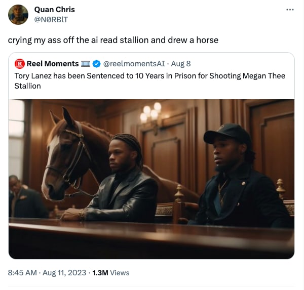 To get away from doom and gloom at the last. This post did numbers last week. The image is from an entertainment news account with an AI images-only hook. They post enough bait to suggest this was deliberate, particularly given that it remains up. The “look at what the stupid AI did” content cycle has many spins left.