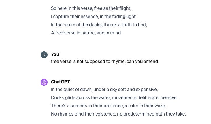 It can’t do it. Here is GPT-4 waxing lyrical on ducks.