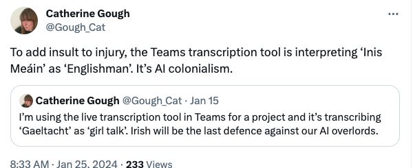 If all existential concerns about AI prove ill-founded and we live in a utopia provided by our AI overlords it will still be a bit deflating if all communication is delivered in a washed-out good-for-all-markets American syntax. This is a lot to take from a single post about Teams not understanding Irish, but as someone who has ranted about Father Ted gifs not showing on Giphy it’s a war I am willing to fight!